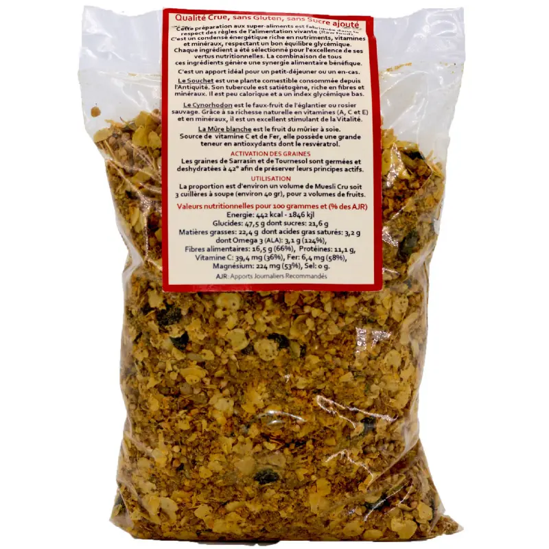Diese Zubereitung wird handwerklich in der Bretagne hergestellt, unter Beachtung der Regeln der Rohkosternährung, ausschließlich mit Bio-Produkten. Die Trocknung bei niedriger Temperatur (<42°) bewahrt die Wirkstoffe all dieser Zutaten.