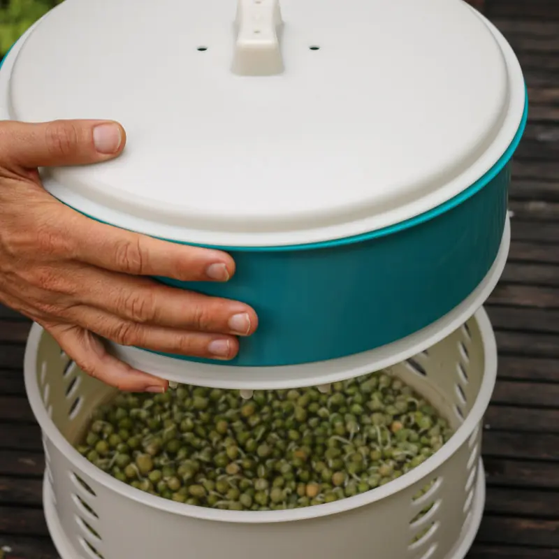 Its main advantage: no pre-soaking of the seeds, no daily rinsing of the seeds. (Except for large seeds – larger than a mung bean – which require pre-soaking)