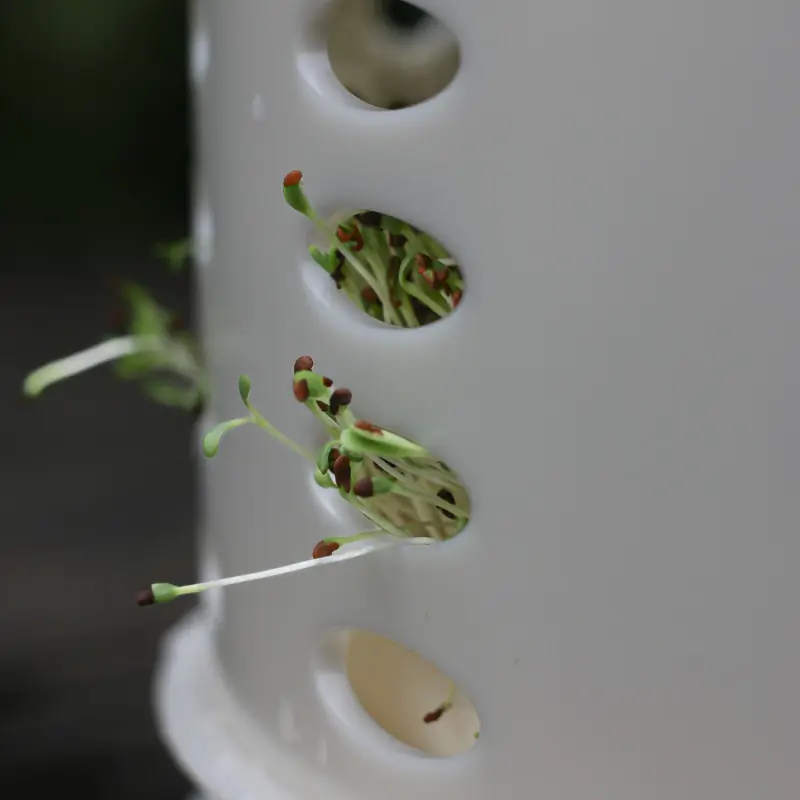 The multiple perforated openings of the enclosure allow for the aeration of the seeds and the passage of light for the proper development of the sprouts.