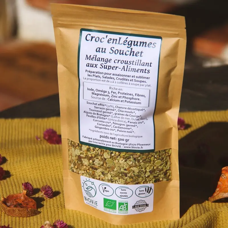 This preparation is crafted in Brittany, respecting the principles of living food, using only organic products. Buckwheat, sunflower, and fenugreek seeds are first sprouted then dehydrated at 42°C. Low-temperature dehydration (<42°C) preserves the active ingredients of all these ingredients. This vegetable crunch mix is a concentrated source of energy, macro and micronutrients, essential trace elements, and of course, flavors.