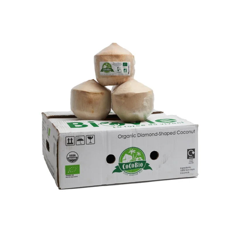 Son orgánicas desde el vivero hasta el envío, que se realiza sin el uso de fungicidas sintéticos en la drupa (como es el caso de los cocos no orgánicos). Nuestra solución de remojo también es natural y orgánica.
