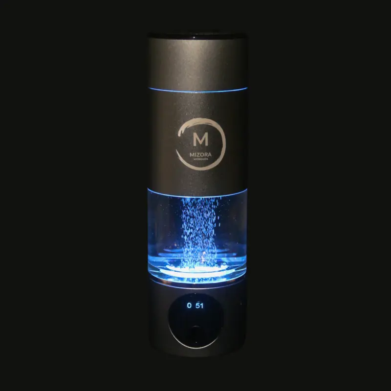 El Mizora™ Pro es un generador portátil que enriquece el agua con hidrógeno molecular (H₂), gracias a un proceso de electrólisis controlado. Sin filtro, sin recarga, transforma el agua potable en agua hidrogenada altamente concentrada.