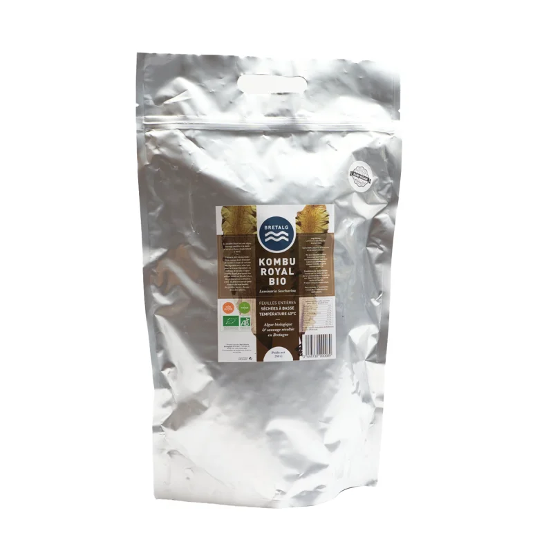 En colaboración con la empresa BRETALG, le ofrecemos kombu en hojas enteras deshidratadas a baja temperatura (40°C) y presentadas en un envase resellable que protege sus algas de la luz. Podrá utilizarlo fácilmente en sus ensaladas y diversas preparaciones.