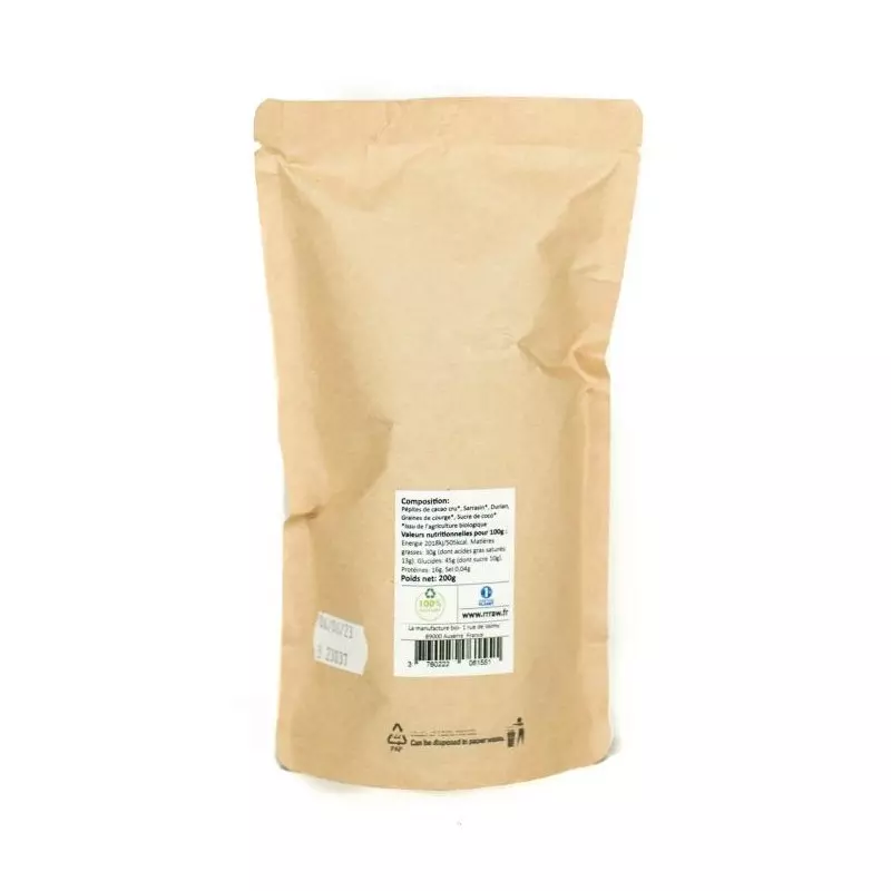 Ingredientes : pepitas de cacao crudo*, alforfón*, semillas de calabaza*, durián liofilizado, azúcar de coco*