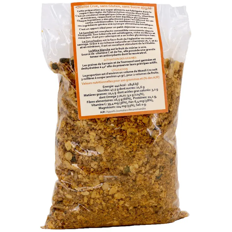 El muesli crudo natural es rico en Vitamina C, en Fibra, en Omega 3, en Hierro y en Magnesio. ¡Pero eso no es todo !