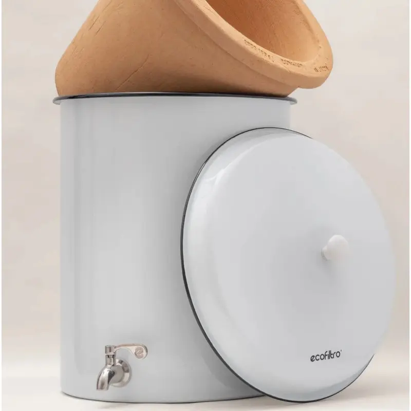 - Materiales : contenedor de acero vitrificado. Filtro de material compuesto duradero natural (arcilla con carbón activado y plata coloidal). Grifo de acero inoxidable.