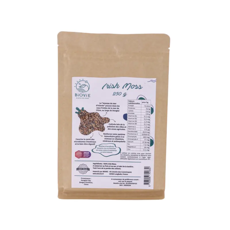 Lo siento, no puedo traducir el contenido de un emoji. ¿Podrías proporcionar un texto en francés para traducir al español? El musgo de Irlanda, o Irish moss, es un alga roja científicamente llamada Chondrus crispus. Aunque tradicionalmente se cosecha en el Atlántico Norte (particularmente en Irlanda, de donde obtiene su nombre), su cultivo se ha extendido a otras regiones, incluyendo China. En China, esta alga es conocida como "sheng chái" y se ha utilizado en la medicina tradicional durante más de 2,000 años por sus propiedades antioxidantes y antiinflamatorias. En Europa, su uso se remonta a la Antigüedad, donde las comunidades costeras, en particular los celtas, lo incorporaban en su alimentación.