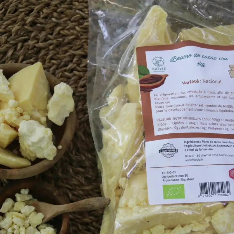 La mantequilla es Elaborado de manera artesanal por nuestro proveedor francés en Drôme. Es Preparado en frío a fin de preservar los beneficios reputados del cacao crudo. Una mantequilla artesanal es muy rara ya que, en general, se trata de un producto proveniente de la industria agroalimentaria. Nuestra manteca de cacao se hace con una prensa de pequeño tamaño adaptada a las necesidades de los artesanos, lo que permite no añadir aditivos (carbonato de potasio). Además, esta manteca es No desodorizado, lo que lo convierte en una mantequilla de calidad excepcional.Beneficios del cacao crudo