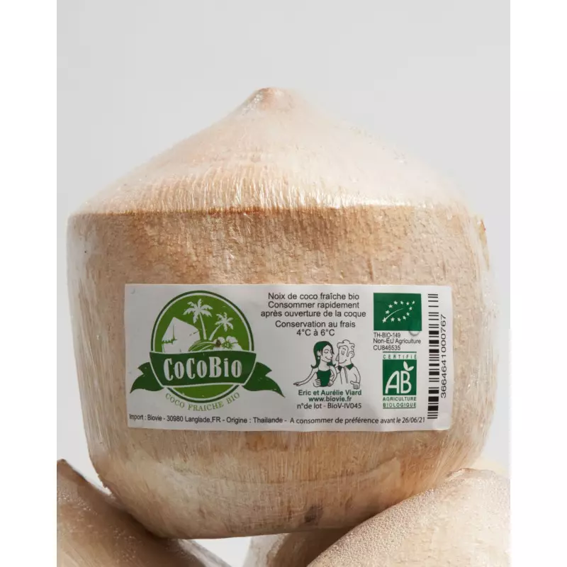 🥥 Ces noix de coco fraîches jeunes biologiques, de la variété Nam Hom, sont remplies d'eau de coco et comportent également de la chair fraîche de coco.