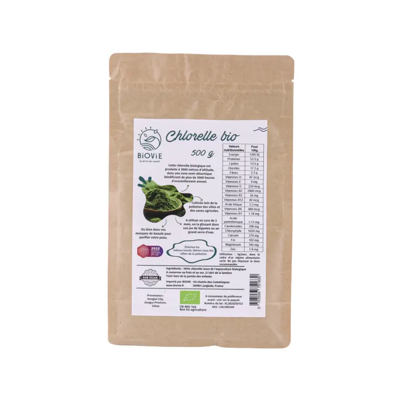 - Ingrédients : 100% chlorelle en poudre, issue de l'agriculture biologique