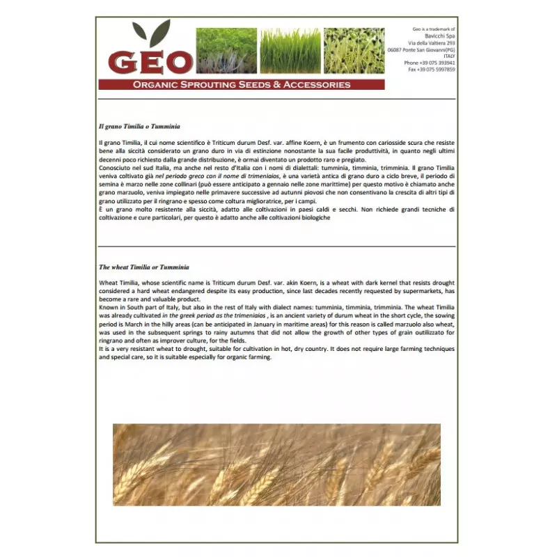 Nous vous proposons la variété de blé Timilia rustique, ancien et certifié bio. Cette variété de bonne qualité a été choisie pour la germination car elle est particulièrement bien adaptée à la production d'herbe de blé. Le jus d'herbe de blé a un goût nettement plus doux que le jus extrait de l'herbe de blé dur traditionnel, et la quantité extraite est supérieure.