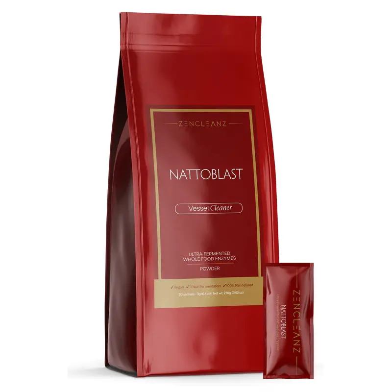 NATTOBLAST est un produit sans anticoagulants synthétiques, uniquement fabriqué à partir de plantes entières fermentées pendant 3 ans pour une absorption supérieure. Grâce à la nattokinase (une enzyme extraite du natto, un plat japonais à base de soja fermenté), cette poudre d'enzymes permet de cibler la viscosité, d'harmoniser le flux sanguin et de soutenir l'ensemble du spectre du bien-être circulatoire : de la détox à l'élasticité.