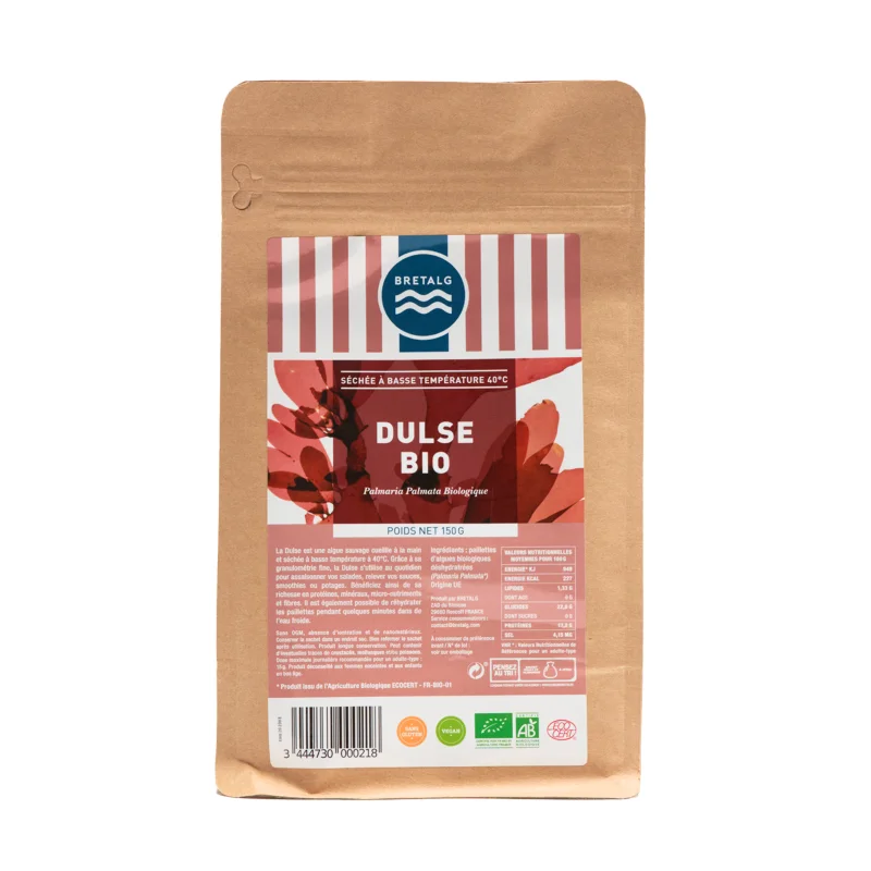 In esclusiva europea, e in collaborazione con la società BRETALG, vi proponiamo l'alga Dulse biologica in fiocchi, disidratata a bassa temperatura (40°C) e presentata in un imballaggio richiudibile in kraft che protegge le vostre alghe dalla luce.