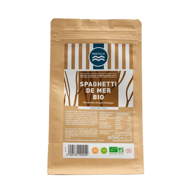 In collaborazione con la società BRETALG, Vi proponiamo l'alga Fagiolo di mare biologica, in fiocchi, disidratata a bassa temperatura (40°C) e presentata in un imballaggio richiudibile in kraft che protegge le vostre alghe dalla luce.