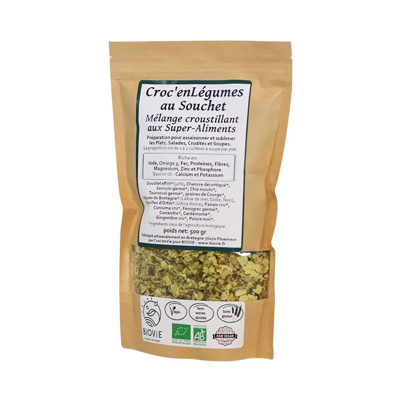 Geen hoofdbrekens meer over het kiezen van "de juiste" supervoedsel of te weten hoe je er meerdere kunt combineren, onze innovatieve mix Croq'en Légumes maakt je leven eenvoudiger. Het stelt je in staat om gemakkelijk een vleugje van elk superingrediënt aan je gerechten toe te voegen, waardoor je maaltijden een boost krijgen in vitaliteit en smaak. Bovendien creëert deze unieke fusie een nutritionele synergie om je lichaam te versterken !