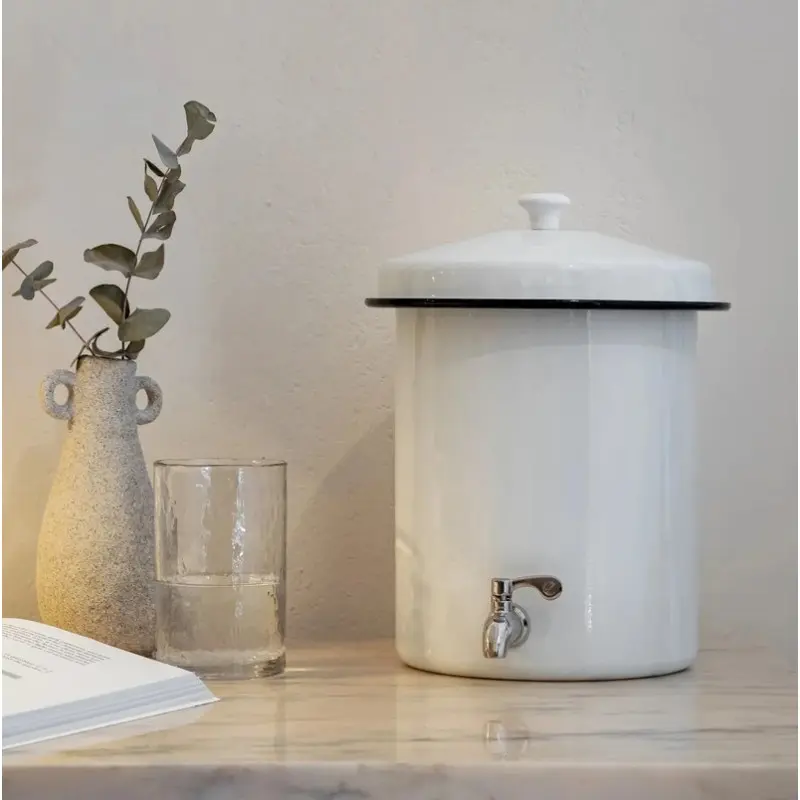 - Materialen : container van geëmailleerd staal. Filter van duurzaam natuurlijk composietmateriaal (klei met actieve kool en colloïdaal zilver). Kraan van roestvrij staal.
