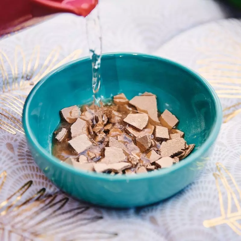 Prepare um recipiente que feche hermeticamente para o seu duche ou banho, no qual você colocará uma quantidade equivalente de Ghassoul e água. As pastilhas vão se dissolver rapidamente para formar uma pasta homogênea que você poderá usar imediatamente, aplicando nos cabelos ou utilizando a pasta obtida como um sabonete líquido.