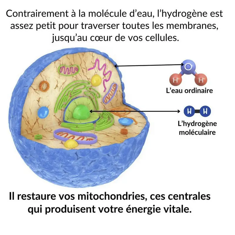 > O H₂ é uma molécula natural, neutra e seletiva. Ela alvo os radicais livres mais agressivos sem perturbar as funções biológicas úteis. Nenhum efeito colateral conhecido, sem sobrecarga: apenas equilíbrio.