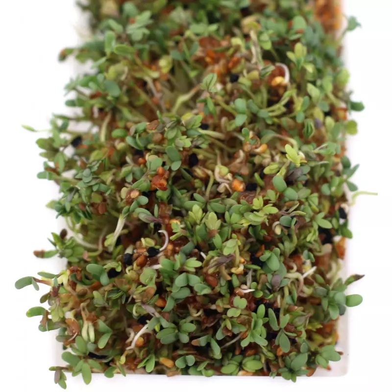 🌱 A alfafa é considerada a semente com os valores nutritivos mais completos, com um poderoso aporte de minerais e a totalidade dos aminoácidos essenciais. O seu sabor fresco equilibra o sabor ligeiramente picante e mais aromático do agrião e da rúcula. As sementes de alho-porro têm um gosto semelhante ao da cebola doce. As nuances de verde vivo desta combinação de sabores estimulantes decorarão os seus pratos maravilhosamente.