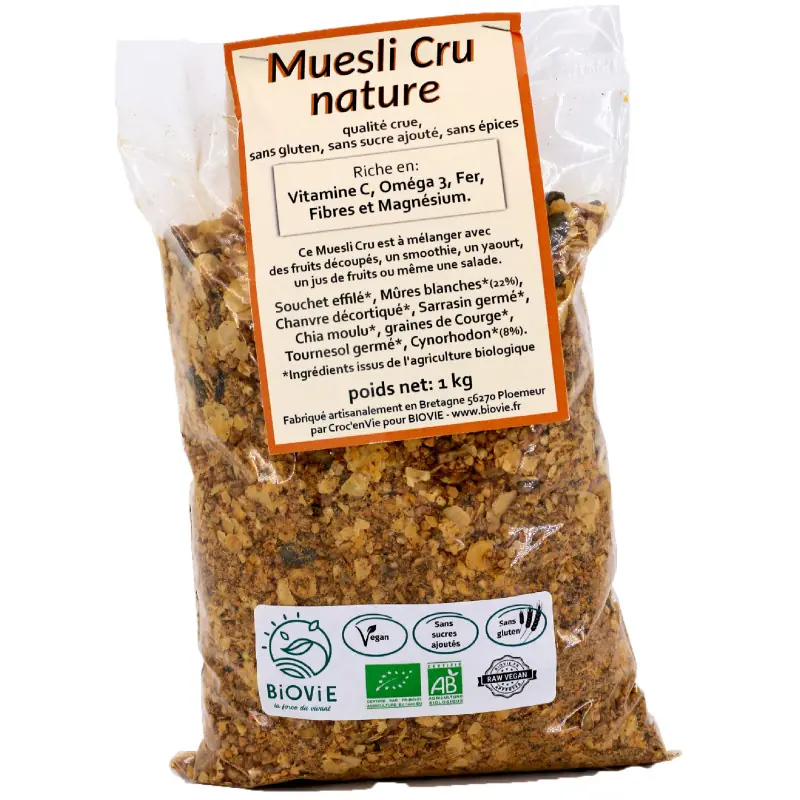 Muesli cru e orgânico com superalimentos, sem glúten e sem adição de açúcar. Natural (sem especiarias). Saco de 1kg ou 500g.